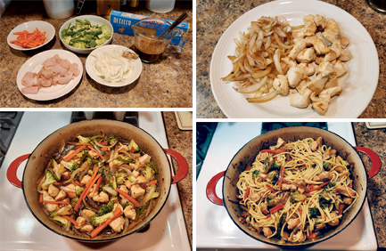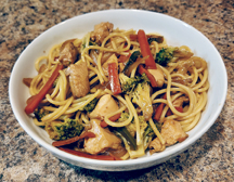 The best thing about this recipe is that you can use any vegetables you happen to have in the house. As you can see from the pictures, this time I had half a green pepper hanging out. Mushrooms would as be good, as well as snow pea pods or even string beans…whatever you have or strikes your fancy. You can also substitute beef for the chicken and use beef broth if you’d prefer Beef Lo Mein. It’s so easy and quick…it took less than ½ an hour. I hope you enjoy.