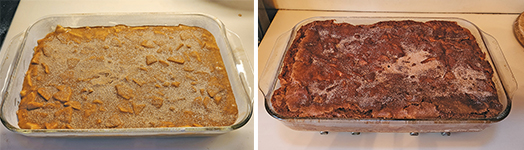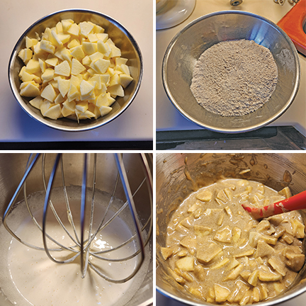 In my opinion, my apple cake was fine, but nothing to write home about…it could be moister and more flavorful. So, my experiment ended up with me almost doubling the number of apples in the original recipe (to help make the cake moister) and quadrupling the amount of cinnamon (I love cinnamon), besides adding a topping. So, some of the amounts in the ingredient list, like the cinnamon, may seem like typos to you. They’re not! This cake is full of cinnamon flavor…and aroma. And, to gild the lily a bit, there is even more cinnamon in the topping! Your house is going to be full of the aroma of cinnamon while it’s baking. Also, when folding in the apples, you’re going to think you have too many. You don’t…most of them will dissolve into the cake while baking and a few will remain as chunks.