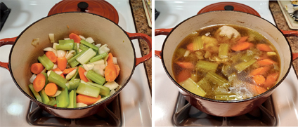 Pour the wet ingredients into the dry and stir until evenly incorporated. Refrigerate the mixture for at least 1 hour, or up to 6. While they’re in the refrigerator, prepare your soup.- In a large soup pot or Dutch oven, heat the Oil on medium heat and gently sauté the Onion, Carrots, Celery and Garlic for about 15 minutes, or until the vegetables start to soften.