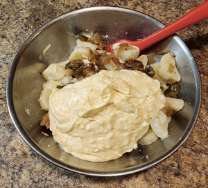 - Add the chopped Pickled Vegetables to the potatoes with the dressing, and gently fold together,