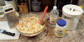 Prepare your cabbage. We always grated it on a box grater, but I find cutting your cabbage into 12 wedges and then making thin slices “against the grain” gives the same result and is a lot less messy. Add your cabbage to a large bowl.- Grate your carrots and onion on a box grater. Measure your onion! Any more than a tablespoon and it ends up tasting like “onion slaw.” Add them to the bowl with the cabbage. Add the salt and sugar. Stir until combined.