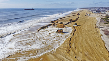 The Great Lakes Dredge and Dock Company is dredging and pumping beach-compatible sand from an offshore “borrow site” off Napeague and placing it on the length of beach between the Benson Reservation on the west to just east of Surfside Place. The additional sand will extend the beach area both above and below sea level, creating a wider beach with a gradual slope that is more resistant to future storms and wave erosion.