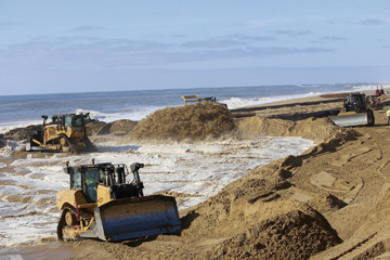 On February 22, I went to the beach to take photos for this update, and was amazed how far along the sand replenishment part of the project had come. When I arrived, they gave me a hardhat and an escort to tour the beach. It was quite an impressive site- watching the mixture of sand and seawater pumping out of the dredge pipe in concert with five giant bulldozers, moving the sand along the beach to create the new beach elevation.