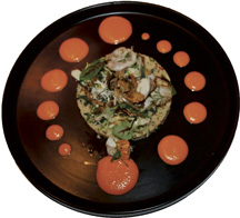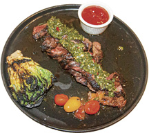 Plated with a lovely display of fennel, lemon and piquillo aioli, the Seafood Salad – consisting of a blend of scallops, shrimp, calamari, pickled mussels, and crabmeat- is served atop a refreshingly herby, lemony, bed of tabouleh. The tanginess of the tabouleh adds a wonderful dimension to the natural clean flavors of the seafood. The extra creamy Burrata is served on a bed of toasted house brioche, adorned with tomato bell pepper coulis, walnuts, cherry tomatoes, Castelvetrano olives, and a whisp of walnut-parsley pesto. Aside from being visually pleasing, each sharable starter is bursting with elegantly curated textures and flavors.