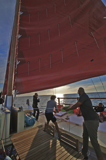 Being a low-emissions vessel, primary propulsion is provided by her powerful schooner sail plan, giving her a comfortable cruising speed of 6-10 knots, and a top speed of up to 16 kts. Auxiliary propulsion is provided by ultra-clean, ultra-quiet Honda engines, but under normal operation these engines are used for harbor maneuvers only. Once at sea, Mon Tiki is a sailing vessel. On the evening of our sunset cruise, it was quite windy, yet during the sail we enjoyed a smooth ride as we were lulled by the soothing sounds of wind and water. It was a perfect relaxing evening- if you haven’t already, you should give it a try.