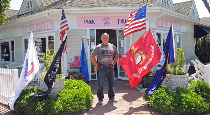 In past years Ken Walles former owner of Montauk’s Oceanside “Smiley Face” Beach Resort, and an MFD Honorary Chief, has been the lead organizer of the Montauk Memorial Weekend, three days of events honoring our veterans. Because of COVID-19 social distancing rules in place this year, Ken had to be creative in finding a different way to share his patriotism. He arranged with Bozena Krasnicki of Montauk’s Pink Frog Café to place eight patriotic flags in front of her shop. Flags unfurled for the weekend included: U.S. Navy, U.S. Coast Guard, U.S. Army, U.S. Air Force, U.S. Marine Corps, POW/MIA flag and two styles of “Old Glory”, the current version and the Betsy Ross flag of the United States of America. Please enjoy the photographs provided here by another Honorary Chief, Richard Lewin.