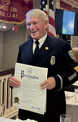 I know I reported last month that Fire Fighter/AEMT Alan Burke received his 50-year pin at our annual inspection dinner recently at Gosman’s restaurant. He also received a proclamation from County Legislator Ann Welker. I wanted to show the photo of Alan receiving this well-deserved award.