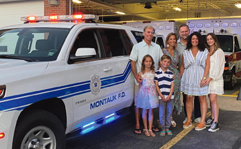 I am thrilled to report great news for the Montauk Fire Department and our Montauk Community. With an incredible display of generosity and community spirit, the Hildreth and Kansler Families of Montauk recently donated a critically valuable vehicle to the Montauk Fire Department. Please see the photo here of them standing beside the new fully equipped Chevy Tahoe that they recently donated to the MFD. The vehicle, designated “9-3-81”, is being used as a first responder vehicle for volunteer personnel to respond to a scene, and to provide medical assistance prior to the ambulance’s arrival. In its first week of service, Paramedic Tom Flight already responded in 9-3-81 and saved the life of a man in cardiac arrest.