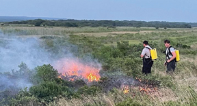 On Friday, July 22nd at 7:10pm the Montauk Fire Department was called to the scene of a brush fire located in the Walking Dunes area of Napeague at the end of Napeague Harbor Road. The fire of undetermined origin was located in a very difficult area to reach in the northern boundaries of the New York State Hither Hills park land. Montauk Fire Chief Scott Snow, First Assistant Chief Ken Glogg, and Second Assistant Chief Peter Joyce Jr. responded, setting up a command post in