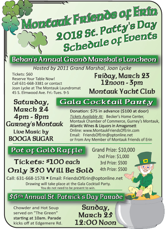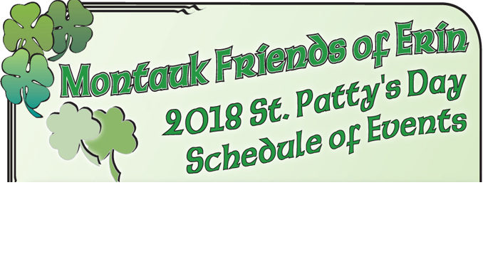 MONTAUK FRIENDS OF ERIN 2018 ST. PATTY’S SCHEDULE OF EVENTS February 27, 2018 Ken Giustino Montauk Columns, Montauksun Story 0 Friends of ErinSt. Patrick's Day Parade