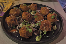 Each season the menu includes some type of meatball, always interesting and new. This season’s style is Grilled Chicken Gyro Meatballs, which are tender and tasty. Put altogether with the accompanying cucumber ribbons, house tzatziki, eggplant tapenade, pickled red onions, and grilled pita it makes a lovely alternative to a traditional meatball.