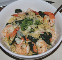 Sauteed Shrimp, spinach, and a lemon garlic cream sauce served over Campanelle pasta made an excellent light springtime Shrimp Scampi dish. Seared to a gentle crisp Plancha Sun Dried Tomato Crusted Salmon served with spring vegetable medley of peas, sweet corn, baby zucchini, and a pea arugula pesto which gave it a little citrusy taste.