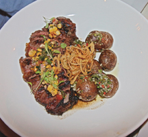 Yum a Carpaccio with wakeme salad and siracha aioli rounds out the dish beautifully with a bit of extra flavor and crunch from the wasabi crust. Yet another tasty new addition to the appetizers is the crunchy outside and creamy cotija cheese and corn centered Corn Poppers, served with avocado crème fraiche, chipotle aioli, and radishes.