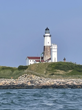 It was July 19th, two days off the new moon and the August Montauk Sun Inshore Journal was due. At 7:40am I hung the stern lines and Captain Steve backed his 36 foot Osmond Beel out of the slip. Cheikh and Deborah were with us for the trip. Osmond Beels are made by H & H Marine. Their website states, “For more than 35 years, H & H Marine in Steuben Maine has built boats in the Downeast tradition: Stable, efficient, safe and reliable.” We headed east and caught some porgies. The published tide for the north side of Montauk Point was 9:52am. We needed to head towards the point to see what was happening. As we passed close to the Lighthouse I watched it being painted. It’s been going through a restoration and it’s fun to watch the stages from the water. Montauk Point Lighthouse is the 4th oldest active lighthouse in the United States and was authorized for construction by the Second United States Congress under President George Washington on April 12, 1792.