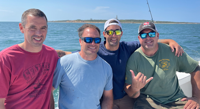 When I put the green “parachute”jigs and red pork rind out on the jigging rods Ryan said, “there’s no way that’s going to work.” Within minutes each one of the four firefighters were reeling in striped bass after striped bass. It was a fantastic ending to a great day.