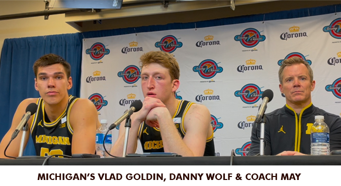 After the game I asked Danny and Goldin about the block and bad pass. Wolf answered “I don’t think Vlad is ever going to be blocked like that.. I wouldn’t want any other shot than that and I don’t think the game came down to that.. I think it’s a lot of other things than that” Goldin said, “we have to be more physical.. they played more physically than we did.. that’s strictly on us”. After Michigan left the press conference Calipari walked in holding his cellphone out. It was on speakerphone with Knicks center/forward Karl-Anthony Towns Jr speaking. Towns said, “I saw your big man shooting threes.. I don’t know what in the hell must’ve happened.. you must’ve had an epiphany” Calipari answered, “I saw you win a game last night shooting threes.. I’m gonna let these guys shoot threes” Calipari went on to say, “you couldn’t guard pick and roll defense.. you still can’t.. look you’re bothering me.. you know I love ya you’re the best.” After hanging up with Towns, Calipari told us how cheap the new Knick was. He said they recently went out to dinner and Calipari had to shame him into picking up the tab by saying, “dude pick up the tab.” They definitely broke the mold on the Arkansas coach. I asked him about Goldin’s comments about Arkansas’ physicality. I said “they said it was your physicality” Calipari answered, “who’s physicality?” I answered “your team’s physicality.”He smiled and smirked looking at Boogie and DJ who were sitting on the floor in the press conference room. When Boogie and DJ took the podium I asked them, “what if anything happened at halftime that lit you guys up to come out and play the way you did?” DJ answered, “we spend a lot of time in practice going against each other.. you don’t get any other player better to go against.. when we get in the game it’s time to have fun.” Boogie agreed saying, “like he said.. honestly just having fun.. I feel like second half.. let’s go out and have a blast.. the atmosphere is crazy.. we’ve got all our fans here.. let’s just go out with a bang.”