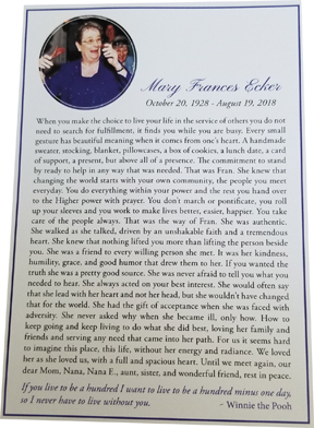 Mary Frances McDonald Ecker loving mother of Edward V. Ecker, Jr., Cheryl Ecker Bloecker, and Catherine Ecker Flanagan passed on August 19, 2018 at the age of 89. In addition to being deeply loved by her children, their spouses, her grandchildren and great grandchildren, there is an entire community that loved her as well. Having personally touched so many lives, whether she, or we, knew it or not, Fran’s reach spread like one of her beautiful quilts over all of Montauk- she will be missed.