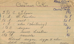 During a recent catch up call that included what our now adult children and grandchildren were up to, the conversation reverted back to the early days of our friendship. Beth said, “I have a question for you. Do you know anybody our age now that still bakes Christmas cookies like we used to?” After hearing that question I was reminded of the cookie swaps we used to have, making the task of baking different kinds of Christmas cookies a bit easier. The concept was a simple one. Each lady brought four dozen cookies of her favorite recipe to share with the others. A few days before the swap, the host had asked for a copy of the recipe if the baker would like to share it. The recipes were mostly handwritten and these were photocopied just as they were submitted and made into a booklet for each guest to take home. The front cover had an illustration of a plate of cookies drawn by the host with the date of the party. I still have my copy in my binder of cookie and pastry recipes.