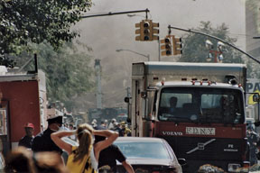The day after the attacks, I left my office in Westchester to go to ground zero. When I reached the West-Side Dr. the road was blocked off and only first responders were allowed to travel south to the city. As a reporter I was also allowed to continue, and as I proceeded south I was the only car on the West Side Drive; the toll was up so I passed straight through. Feeling as if I were truly entering a war zone, I drove as far as Bleecker St. where all roads going south were blocked off with armed guards. Again, I was allowed to continue.