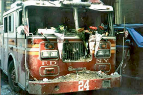 Two blocks in towards ground zero, the ground was covered with gray soot so I put on my mask and goggles. Four blocks in, parked along the road, were crushed police cars, ambulances, and firetrucks that the second tower had fallen on; they had been towed away from ground zero. Flowers had been placed on the vehicles for the many first responders who had perished the day before. I noticed the impressions of my feet getting deeper in the soot as I continued. There weren’t any people on the street at this point and not much noise, only some sirens in the distance. An older woman was just standing on the corner and it looked like she was in shock, I asked her if I could help her and she just said, “God bless you and moved on.”