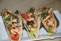 Naturally, with all this delicious food, one needs an equally impressive beverage to accompany it and the cocktail choices doesn’t disappoint. With catchy names like the Duck Dive, Ditch Plains Mojito and Sunshines Revenge, to name a few, deciding wasn’t easy. But what caught our eye was a fantastic combo that was an upscale touch for their Classic Bloody Mary. A menu notation said “Make it FAT with Lobster Slider, Bacon, Shrimp”. Who could resist this combo, so one in our party ordered it. What arrived was an eye catching presentation, with a tall bloody Mary, atop of it was a lobster salad slider, jutting out from the glass were elongated slices of bacon and a large crispy shrimp. It was almost a meal in itself! Another friend ordered the Drunken Yogi, which was a mango infused Spring 44 Vodka, Crème de Coconut, pineapple. First thinking this drink might be too sweet, she was pleasantly surprised at the smoothness, yet not overly sweet taste this tropical combo presented. Along with the many creative cocktails there is a list of local and classic beers, and a wine list. One would think with the appetizers we shared there wouldn’t be room for entrees, but with hearty appetites because of either a skipped lunch or light one, we were ready to order. Once again we shared, so we could try a multitude of plates. It was the best option since the descriptive entrees were all so enticing. Naturally, dining with four people, the preferences are wide ranging, which worked perfectly for ordering the Baja Tacos, Saltbox Fish N chips, the Ultimate Burger and the Local Day Boat Scallops. The scallop dish arrived with perfectly grilled scallops, with arugula, resting on a bed of farro (a whole grain, much like barley or quinoa). It’s written that farro gets an “A-plus nutritional rating. It’s nearly fat-free and completely cholesterol-free, making it a heart-healthy choice and perfect for vegetarians and vegans. It’s a great source of iron and is extremely high in fiber.” Each bite was tasty and the scallops quite tender. All four gave thumbs up to the Baja Tacos with grilled shrimp, tucked inside a soft corn tortilla shell, with tomato salsa, sriracha aioli. Plump, tender shrimp is just what you’d expect while dining in Montauk on an evening out. Local catch fish or tofu fillings were also available as tortilla choices, if preferred. Saltbox Fish N chips arrived tempura style skate, with homemade chips, spiced tartar sauce and two of us that picked away on that one, only offering a tad tasting to the others, it was so good. All in all, the entrée sampling was a great idea for us that night as now we know what we’d like on our return visit, and we will be back for the items we missed and to order our winners that night!