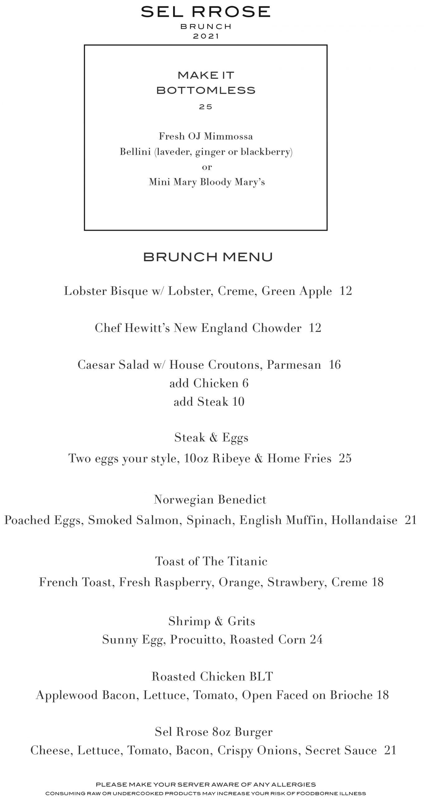 Even as we prepare to say goodbye to 2020 and eagerly yearn to welcome 2021, we’re still dealing with Covid and all of the precautions necessary to try to keep ourselves and others safe. However, that doesn’t mean we can’t enjoy a delightful, relaxing brunch! The Sel Rrose New Year’s Day 2021 Brunch Menu is sure to help you forget any stress of the moment. In addition to delicious ala carte choices including; raw bar options, soups, salad, eggs, steak, french toast, specialty sandwiches, and more… enjoying the option for bottomless Fresh OJ Mimosas,