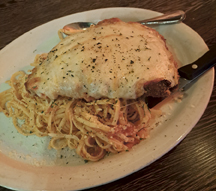 There was a wonderful array of choices on the evening Specials menu including Pan-Seared-Scallops, Fresh Catch Fish Tacos, Jamaican Jerk Wrap with grilled chicken, Fluke Francaise, or a lamb, chicken or falafel Gyro. For us, Chef prepared the thick Grilled Center Cut Pork Chop which was outstanding. Tenderly grilled and topped with a delicious Sausage-Red Pepper Sherry Wine Chutney, atop a bed of creamy sweet potato mash and the tasty sauteed broccolini. Our final dish was Garfield’s famous Chicken Parmesan. A very generous portion of Chicken Cutlet, thick, but not too thick, coated with seasoned bread crumbs and fried to a perfect crisp while preserving the tender juicy chicken, then topped with mozzarella and Italian seasoning. Served with a bed of pasta, this dish is not only delicious, but a substantial meal which will almost definitely result in tasty left-overs.