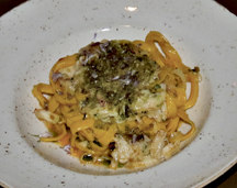 We ordered a variety of dishes from the creatively unique menu, however, along the way additional choices were sent out. A gorgeous platter of raw clams and oyster, and cold crisp shrimp looked almost too good to eat. But I’m glad we did, you could taste the freshness. From the appetizers we chose The Spring “GREEK” which includes sugar snap peas, Persian cucumbers, taggiasca olives and mint atop Sardinian whipped feta. The gentle blend of flavors presented a perfect taste. We also enjoyed the “Anna Mary” Lobster Veloute which is a lovely light creamy pink soup, along with the fresh Tuna Crudo with preserved lemon, capers, with a pumpernickel crumble top.  Another appetizer that was prepared perfectly was the Grilled Spanish Octopus with olive oil crushed potato, lamb bacon, salsa verde and espellette accompanying it. I think if we hadn’t been doing a tasting, I’d have a very difficult time choosing just one appetizer.