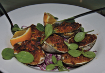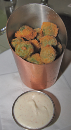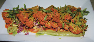 The lightly coated crisp Fried Olives with Meyer lemon goat cheese presented in a copper art deco tin were bursting with delightful flavors. Also with light crisp panko topping, the South Eds Clams with herbs, Meyer lemon and Reggiano parmigiana were a perfect blend of flavors- and one of my favorite dishes. Pan seared cauliflower spears with buffalo sauce and a side of coconut-avocado puree was a unique and spicy Buffalo Cauliflower dish. The