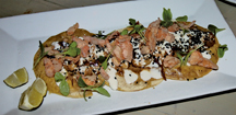 When dinner arrived, we realized our eclectic choices including fish, pasta, shrimp and pork, although abundant, were perfect. Sesame Shrimp Tacos– yet another one of my favorites– are full of shrimp and a creamy sauce blended with delicious flavors of pickled ginger, pablano pepper, spring onion, red cabbage, queso cotijo, crema and lime- all atop corn tortillas. The perfectly