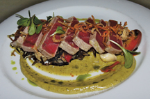 Seared Yellowfin Tuna is cooked rare, sliced, and served on a beautiful platter of wild black rice, artichoke hearts, heirloom tomatoes, basil-broccoli puree, Thai-chili oil, and crispy shallots.
