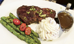 equally attractive with the thick, juicy steak practically still sizzling, plump, grilled asparagus next to it, while the mashed potatoes were swirled into a decorative formation one would similarly see on a soft served cone. A small gravy server was on the plate, if extra steak sauce was preferred. When the cod entrée arrived, the size of the portion, topped with field greens and light creamy curry sauce, with side slices of oranges all on the bed of spinach was almost too picturesque to be disturbed.