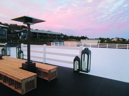“We wanted it to be light enough to sit on the roof of the spa, and ice is just too heavy,” said Simon de Swaan, Gurney’s Food & Beverage Director, who oversees the rink. “We oil it daily, and it is just a bit slower than real ice, but people are still enjoying it.”