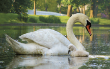 The Mute Swan is monogamous, and the mating pair does almost everything together from building and maintaining the nest to sharing the egg incubation responsibility and protecting the offspring. Only about 3% to 5% of roughly 5,000 species of mammals are monogamous. Ninety percent of birds are socially monogamous, but not necessarily sexually. The Mute Swan’s bond with its mate is quite solid, and rarely will they change partners unless one dies. When a Mute Swan’s partner dies, it exhibits behavior often compared or