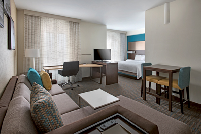 The suites at the Residence Inn are beautiful, extremely spacious- bigger than most NY studio apartments-and the layout is perfect; accommodating all of the amenities with lots of living space. There is a well equipped kitchen with a microwave, and efficiency sized stovetop, refrigerator and dishwasher. It’s perfect for a short visit or even for an extended stay.