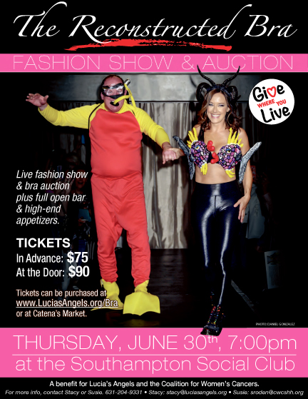 The 10th year of the Reconstructed Bra Fashion Show and Auction will be held at the Southampton Social Club on Thursday, June 30th and will feature 10 models; 20 wearable works of art, designed by local artists; and 5 well-dressed or costumed escorts. The auctioneer of this wildly-entertaining event will be a local favorite, Michelle Reilly of Herbert and Rist. Ms. Reilly also has a deep connection to the cause as one of her best friends was named for one of the event’s benefactors – Lucia’s Angels.