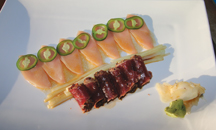 From the sushi bar, the Yellow Tail Tiradito consists of perfectly sliced yellowtail topped with shaved jalapeno and Yuzu sauce. While the Pepper Tuna adds a little peppery flavor to the thinly sliced seared pepper crusted yellow fin tuna with Ponzu sauce. Both were fresh and delicious, presented on a platter garnished with delicate julienne cucumber.