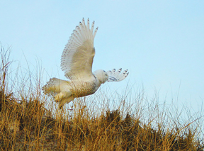 Snowy are the largest avian predators of the high arctic. Their total height is the same as the Great Horned and Great Grey owls, which is 27″, that’s equivalent to 3 soccer balls. Their wingspan has been recorded between 4′ 9″ and 6′ in length. Their wing feathers are comb-like with serrations that allow the owl silent flight. They are certainly capable of gliding; however, they rarely do and often don’t exceed 500′, even during migration. The Snowy is largely a migratory bird of prey, sometimes migrating south in large numbers. Many of the juveniles will travel even farther south than the adults so they don’t have to compete for food with the larger birds. That’s basically why they visit us here on the east end of Long Island during our fall and winter months. Our shoreline dunes resemble the low rise tundra landscape of the arctic, which are loaded with a variety of rodents and other small mammals, making hunting a breeze. Snowy owls also like to inhabit saltwater grass meadows and freshwater wet meadows, especially for hunting. Both of these meadow habitats are found from Amagansett’s Lazy Point area eastward to Montauk and are favored by the Snowy owls each year.