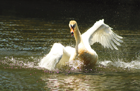 This is a general preening process; first comes the bath. Bathing encourages preening while preening promotes water-proofing. The bath can be achieved a number of ways but the objective is to get ALL the feathers wet. Whether flopping, splashing, dipping, diving, the act of bathing is exciting and action packed. I LOVE to photograph swans and ducks at high speed while they carry on bathing. Their expressions are often equally entertaining. Once the feathers are washed, the swan will usually swim off with a mate, other accepted swans, or even alone to shallow water or a favorite low bank preening site. It’s there that a swan will begin its daily ritual of preening.