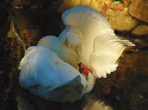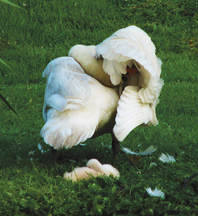 A healthy swan will preen at least 2 hours a day. Each feather lasts a year and must be cared for diligently. Swan feathers are a brilliant white, covering the swan from ankles to face (cheeks). Their wing feathers are light weight and quite strong. Besides being a key appendage for flight capabilities, feathers protect birds from elements like heat, cold, rain, snow, and wind. Even small hail will bounce off the protective shielding of a swans wing and body feathers. Most importantly, properly water-proofed feathers keep the insulating down feathers from becoming wet. Frayed, worn out feathers are much harder to keep properly water-proofed. After awhile these worn feathers will collect minerals from the water, turning their striking white plumage to a duller shade of beige. The larger feathers will also become pointed and lacking feather structure.
