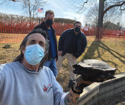 I put together a great crew of volunteers to help me watch for turtles. PJ Delia, Kathy Green, Paul Frediani, Brook Spencer, Lisa Blinderman, Bobby Gold and a number of awesome folks who were on stand-by should we need more volunteers. Together we continued recovering turtles, bullfrogs, and dozens of fish, mostly “pet” goldfish (carp) including two beautiful Koi fish. We all check the pond throughout the day, starting early before the digging begins, every hour while they are working, again after they finish and up until dusk. We have cameras watching the ponds surface and I search for turtle tracks in the mud from above with my drone every few days. The machine operators also keep a keen eye out for anything while they carefully scoop at the mud. We’ve had ZERO injuries (both human and animal) since the project started and as of April 21st, they are half way done. They are on schedule and hope to have the dredging completed by mid-May.