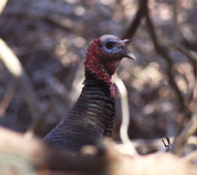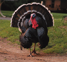 The red fleshy bags on the neck of a turkey is called a “wattle”, however the fleshy growths covering the head are called “caruncles”. Lastly, the long fleshy object that flaps over the males beak is called a “snood”. The males have a bony pointed “spur” on the back of each lower leg, similar to other male Galliformes including roosters, guinea fowl, pheasants and partridges. These are generally used in mating competition or territorial defense. To humans, the turkey is basically harmless. A favorite game bird among hunters, they prove to be quite challenging. Not only do they have great eyesight, sense of smell, and a keen sense of hearing (even though they have no external ears), but they are extremely smart and very fast runners. When they feel threatened, they retreat at high speed while keeping their body, head and neck as low to the ground as possible. And although the wild turkey is considered a gamey yet delicious meal, it is still the favored domestic bird that gets all the credit at Thanksgiving and during the holidays.